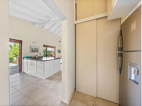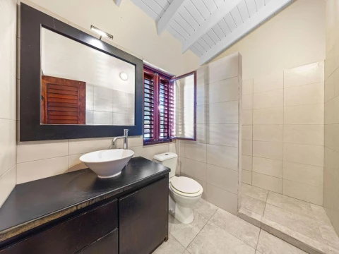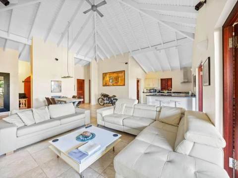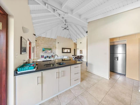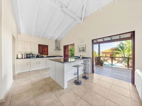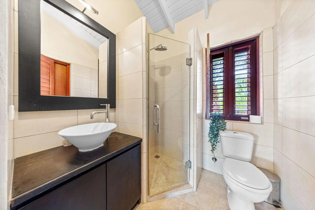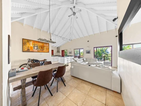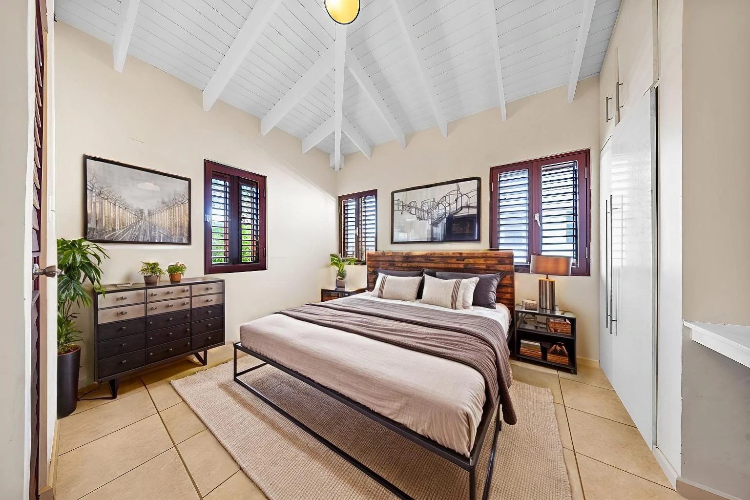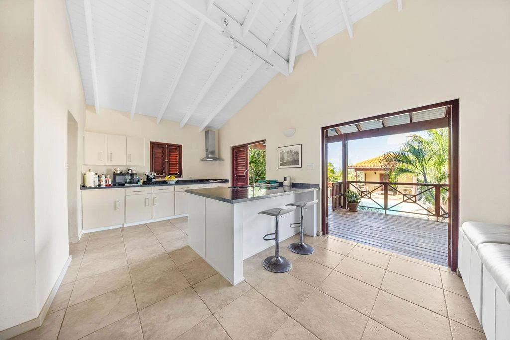 Stepping outside, the true essence of Casa Euphoria comes to life. The expansive garden is a serene oasis, where lush greenery surrounds you, providing a peaceful retreat from the outside world. The sparkling pool serves as the centerpiece, inviting you to take a refreshing dip or simply bask in the sun while enjoying the natural beauty that envelops the property. Two charming gazebos provide shaded spaces to relax, entertain, or dine alfresco, offering the perfect spots to enjoy the cool island breeze.