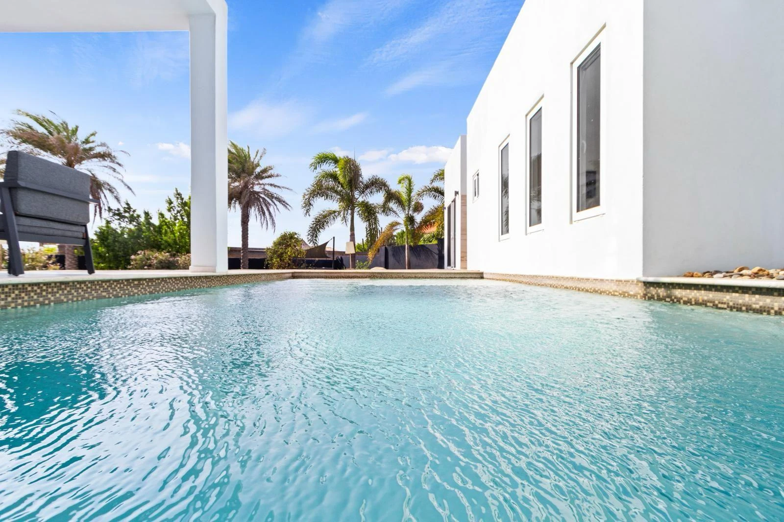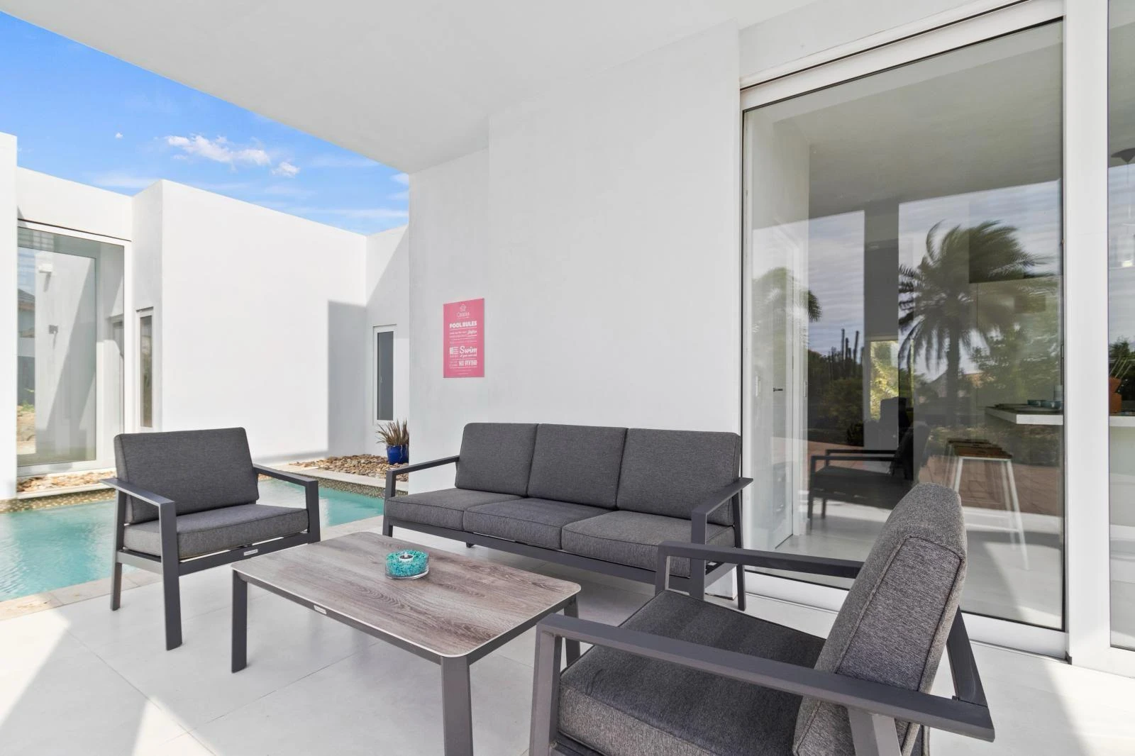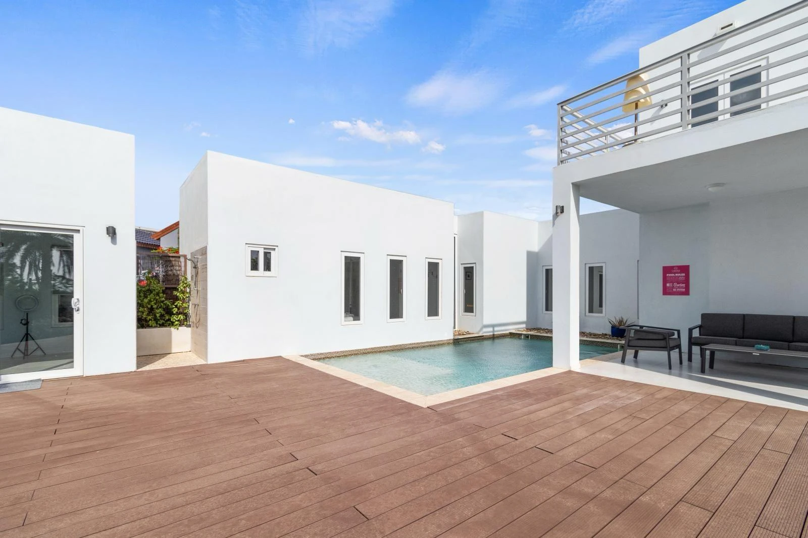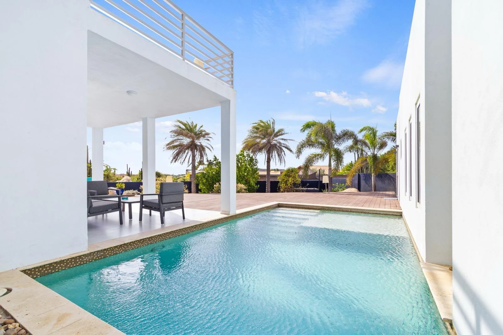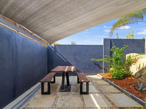 The backyard is a true highlight of the property. A private swimming pool offers the ultimate way to cool off, while multiple lounge areas invite you to relax, read, or entertain outdoors. The landscaped garden, shaded by palm trees, creates a tranquil environment ideal for long afternoons at home.