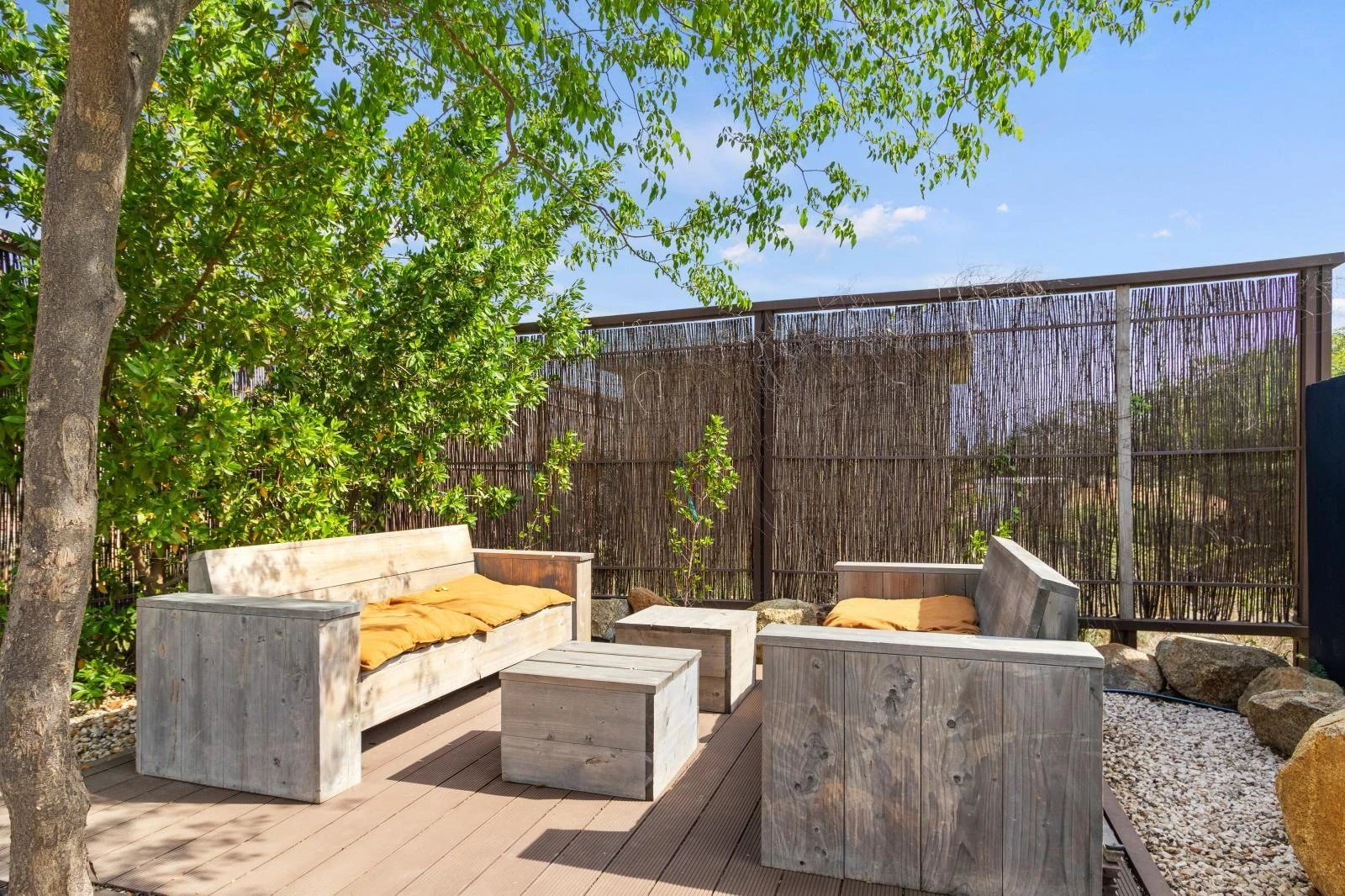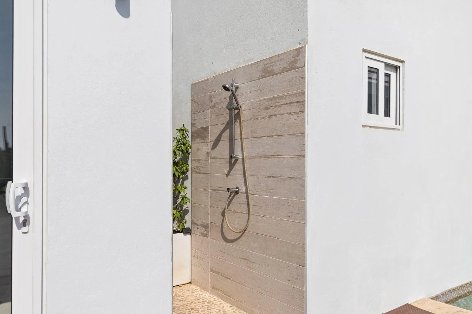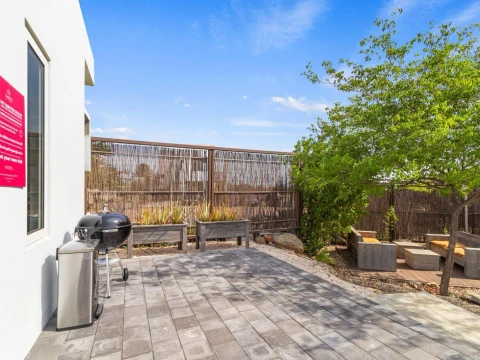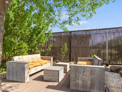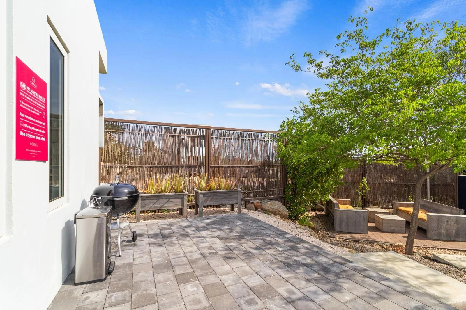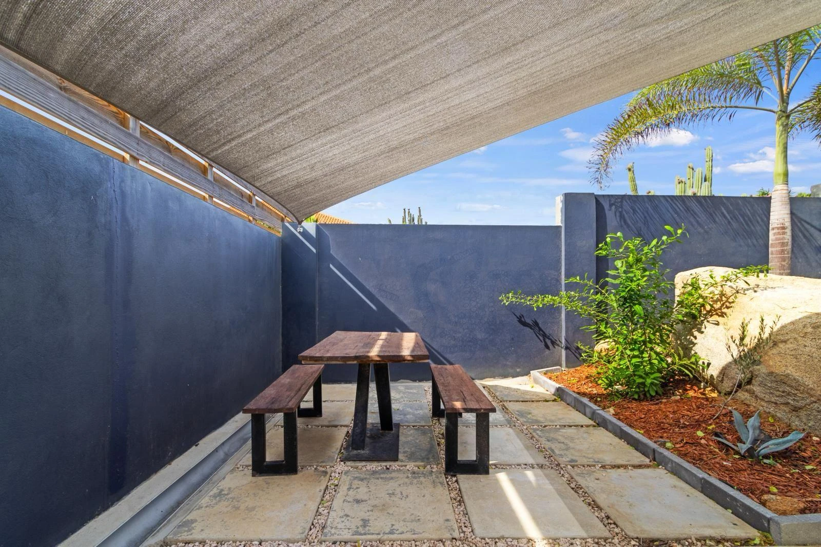 The backyard is a true highlight of the property. A private swimming pool offers the ultimate way to cool off, while multiple lounge areas invite you to relax, read, or entertain outdoors. The landscaped garden, shaded by palm trees, creates a tranquil environment ideal for long afternoons at home.